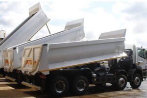 A truck, that has a rear platform which can be raised at the front end to enable the load to be discharged by gravity.